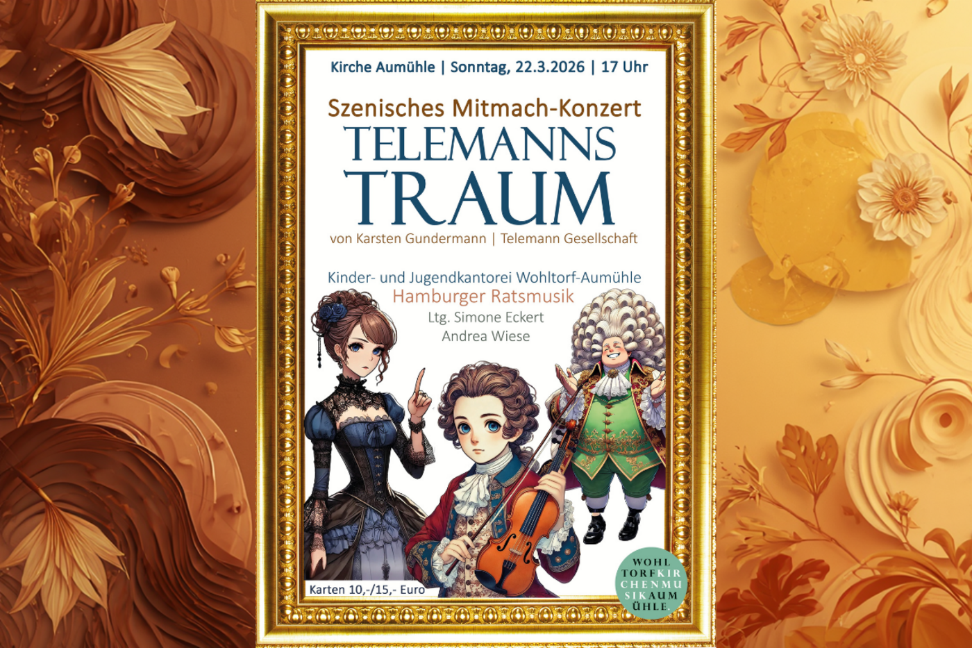 In der Aumühler Kirche können sie am 22. März die Geschichte des jungen Telemann aber auch in einem szenischen Mitmachkonzert erleben. Nach dem vom Hamburger Dirigenten Karsten Gundermann geschriebenen Buch, musikalisch begleitet von der renommierten Hamburger Ratsmusik und gespielt, gesungen und moderiert von den Kindern und Jugendlichen unserer Wohltorf-Aumühler Kantorei. Clara Brosse gibt den jungen Georg Philipp. Nina Schega, Luca Riepe und Diakon Tobias Knöller vervollständigen das „Barock(e)“- Schauspielensemble. Pastor Tobias Knöller moderiert. Zuschauer und Zuschauerinnen dürfen sich ebenfalls mit einbringen und Teil der Aufführung werden.