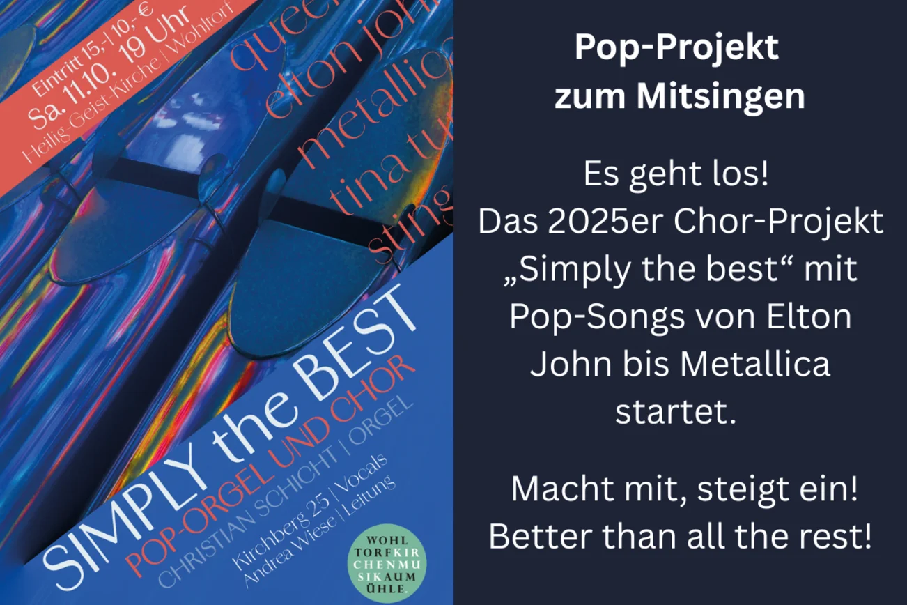 Es geht los! Das 2025er Chor-Projekt „Simply the best“ mit Pop-Songs von Elton John bis Metallica startet. Mit dabei: Christian Schicht („piano-man“ beim „Kirchberg-Varieté) an der Orgel (she is „simply the best“) Macht mit, steigt ein! Better than all the rest!